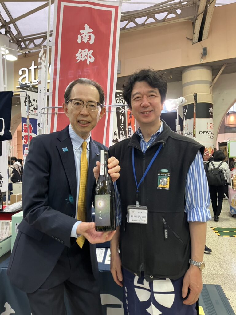 4月1日~5日、JR上野駅中央改札前で開催されている「ふくしまDCフェア」。福島県の特産品を毎日「はこビュン(新幹線や特急列車を利用した輸送サービス)」で運び、福島県の魅力をアピールするイベントです。矢澤酒造店も出店し、矢澤社長自ら販売しています。そこへ、福島県の内堀知事が視察に訪れ、矢澤社長と写真に納まってくださりました。