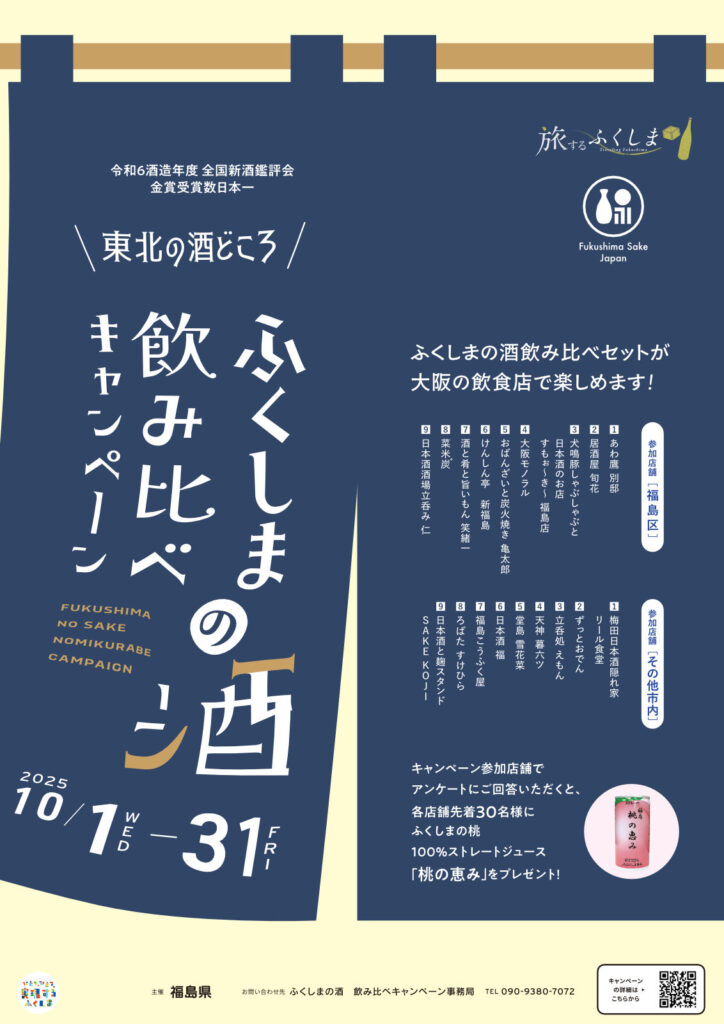 福島の銘酒を大阪市内の18の人気飲食店で飲み比べできるキャンペーンが開催されます。矢澤酒造店のお酒は福島区「酒と肴と旨いもん 笑緒一」と北区の「堂島 雪花菜」でお楽しみいただけます。2025年10月1日~10月31日の期間限定キャンペーンです。お早めにどうぞ!