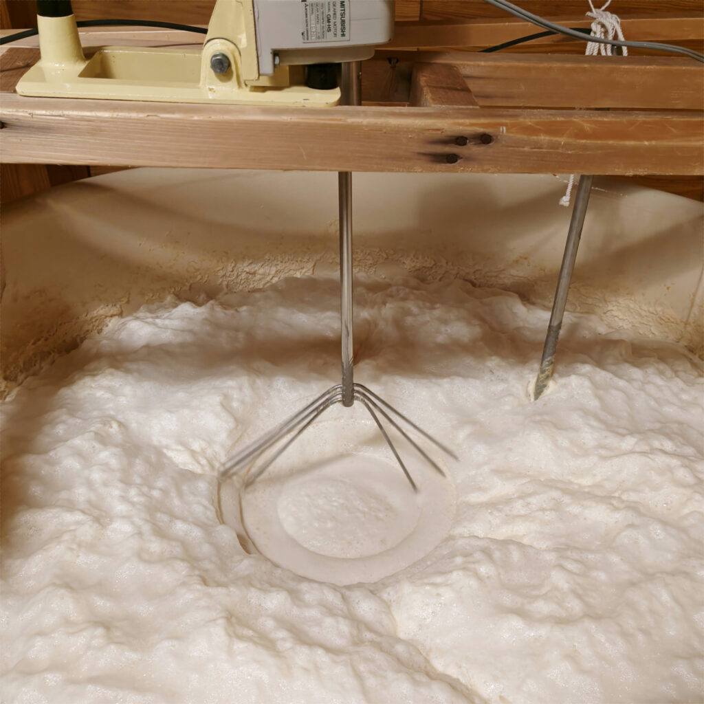 ほぐされた蒸米はホースの中を通ってタンクに運ばれていきます。